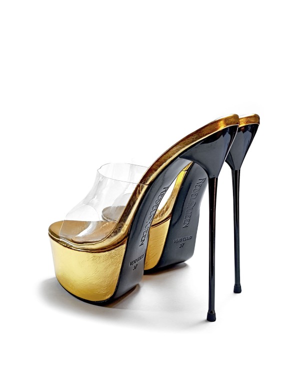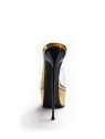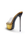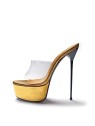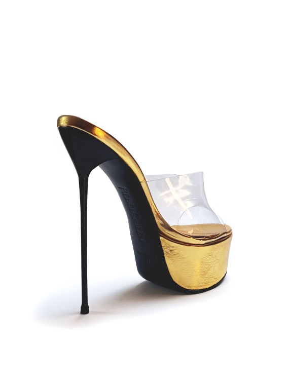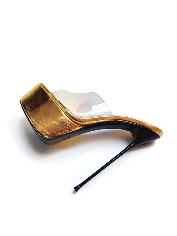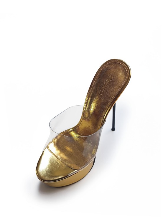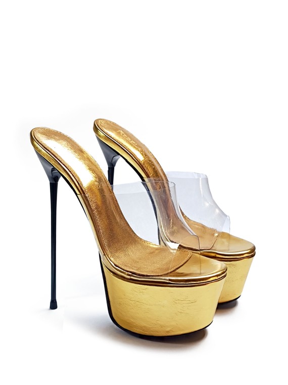 Zabłyśnij z naszymi luksusowymi złotymi klapkami na obcasie z przezroczystym paskiem! Kwintesencja nowoczesnego glamour i ekstrawagancji. Błyszcząca złota platforma i wysoki obcas połączone z transparentnym paskiem tworzą efekt "niewidzialnego" wsparcia, który optycznie wydłuża nogi. Idealne klapki na platformie na specjalne okazje, wieczorne wyjścia, czy letnie imprezy. Poczuj się jak prawdziwa gwiazda i spraw, by każde Twoje wyjście było niezapomniane!